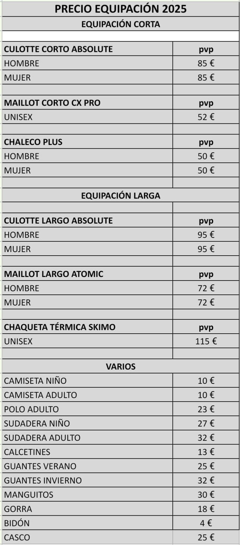 Las equipaciones solo se pueden adquirir en nuestro local físicamente. Tabla de precios.